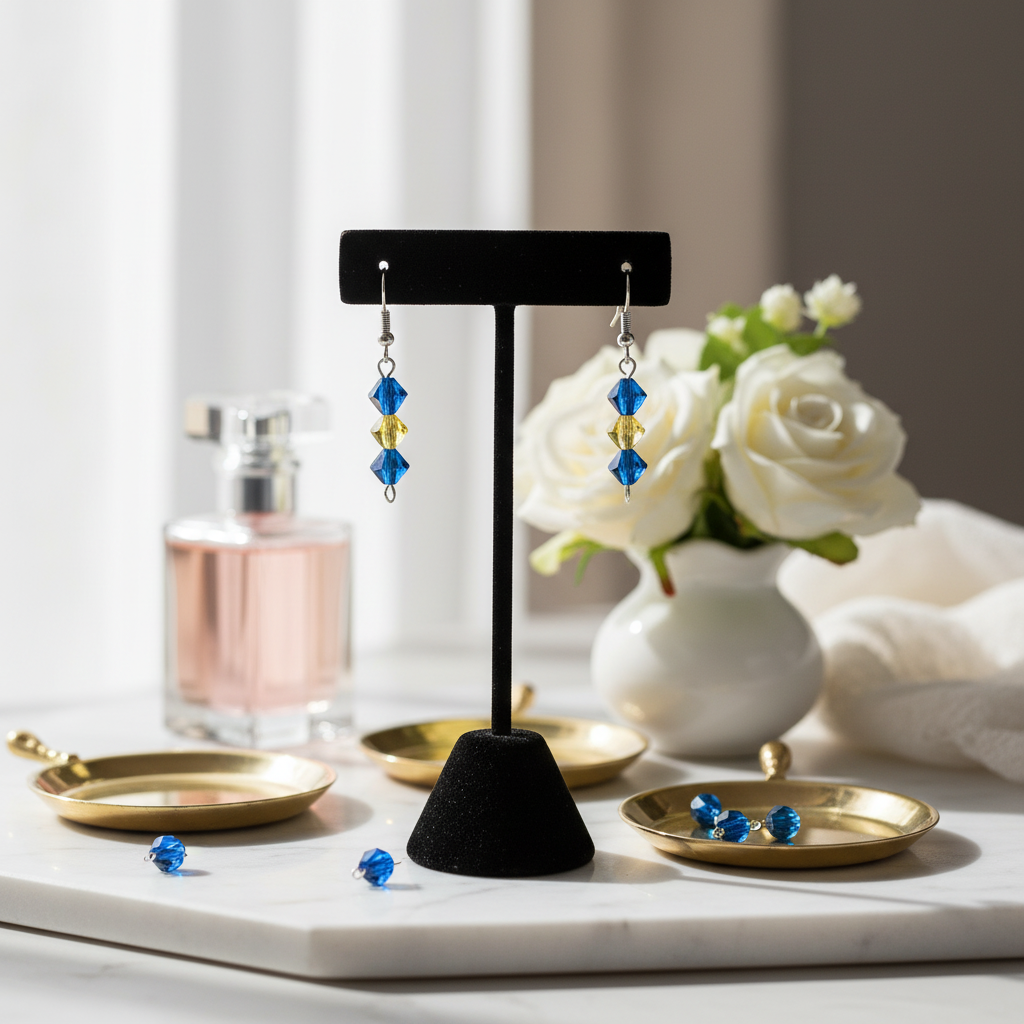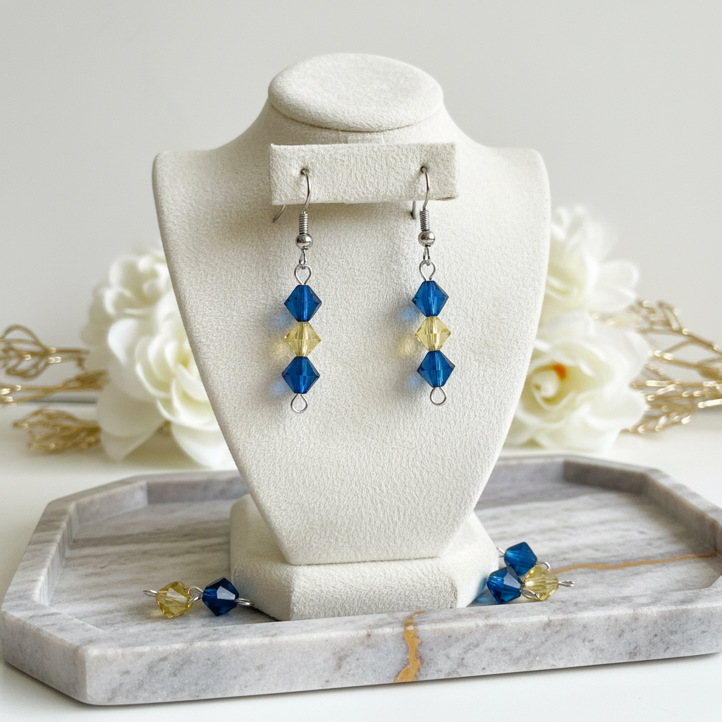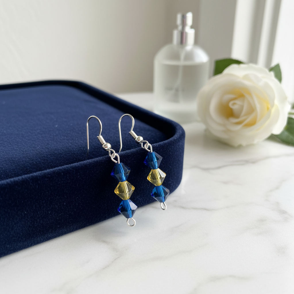 Elegant blue and golden crystal drop earrings inspired by the colors of a bright sky meeting the horizon. Their sleek vertical design adds a touch of sparkle and sophistication, making them perfect for both everyday wear and special occasions.