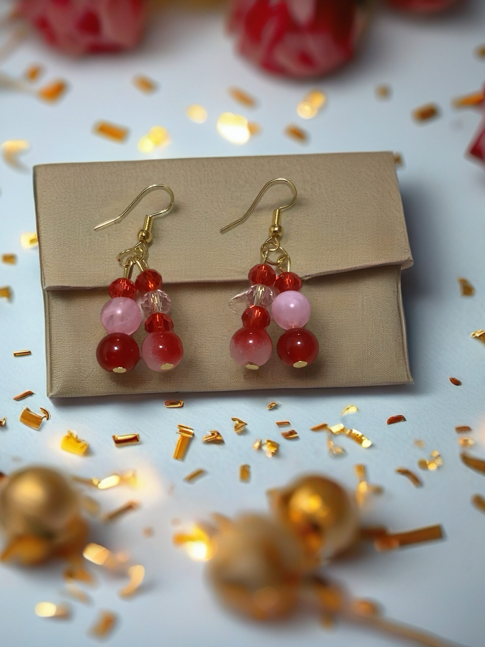 Handmade earrings with soft pink and vibrant red bead accents, creating a playful yet elegant look perfect for adding a pop of color to any outfit.
