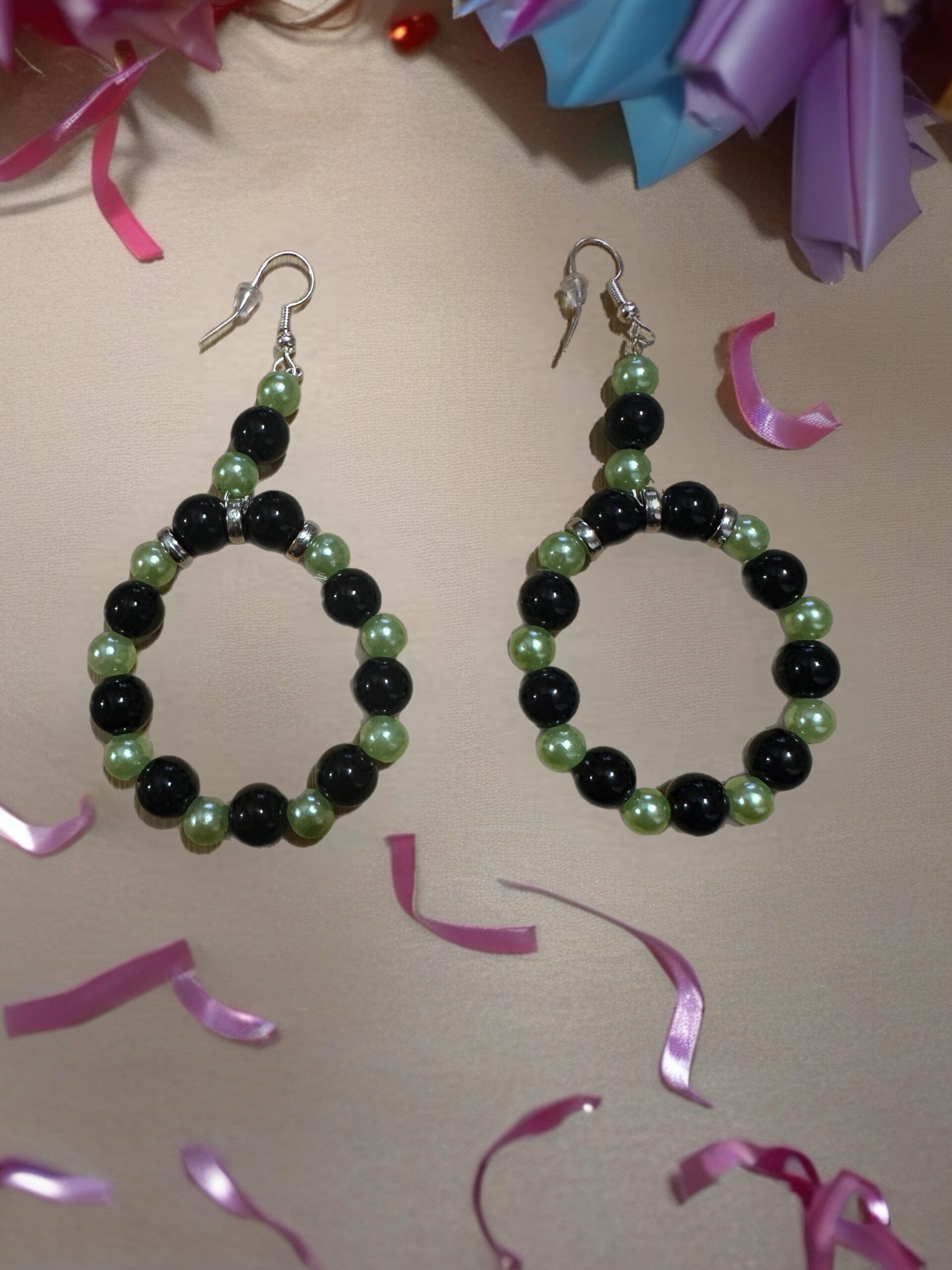 Handmade beaded hoop earrings featuring rich emerald green and classic black beads—simple, elegant, and perfect for everyday wear or a subtle statement look.