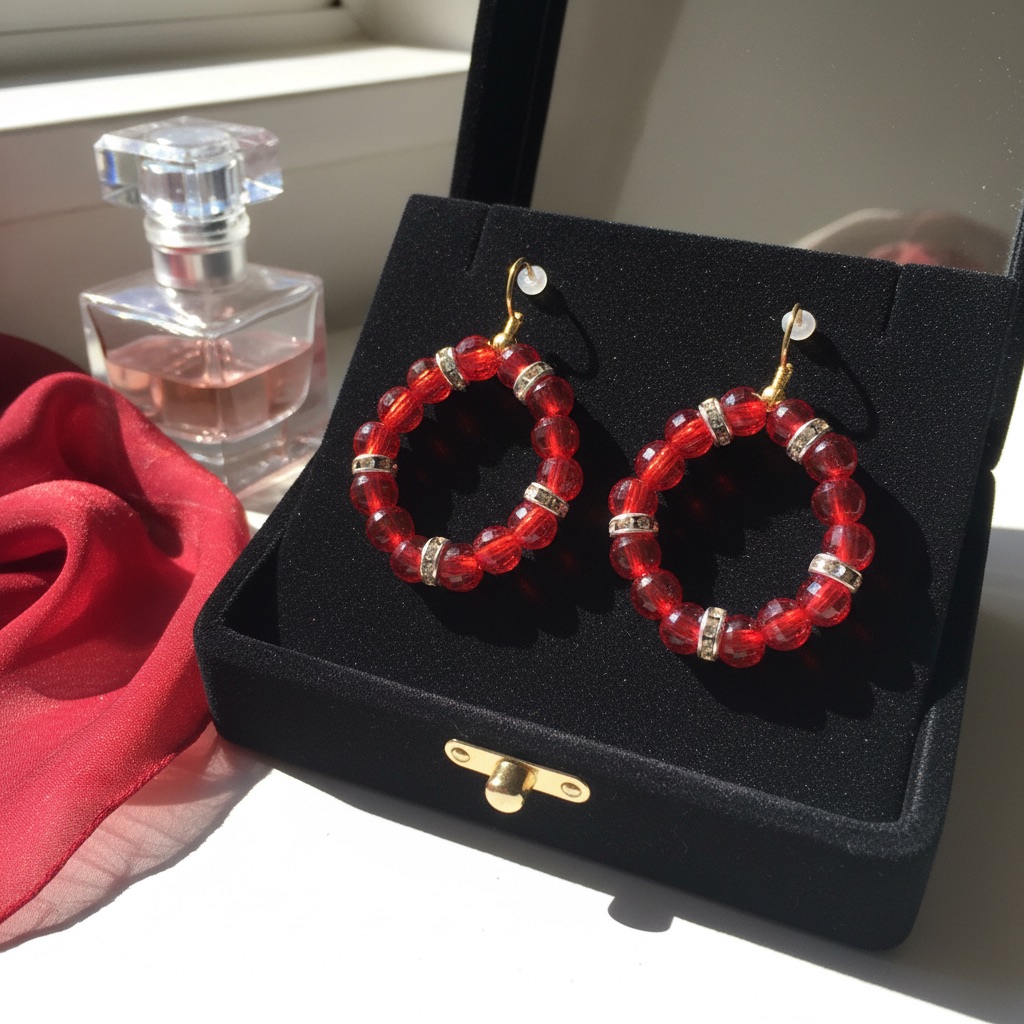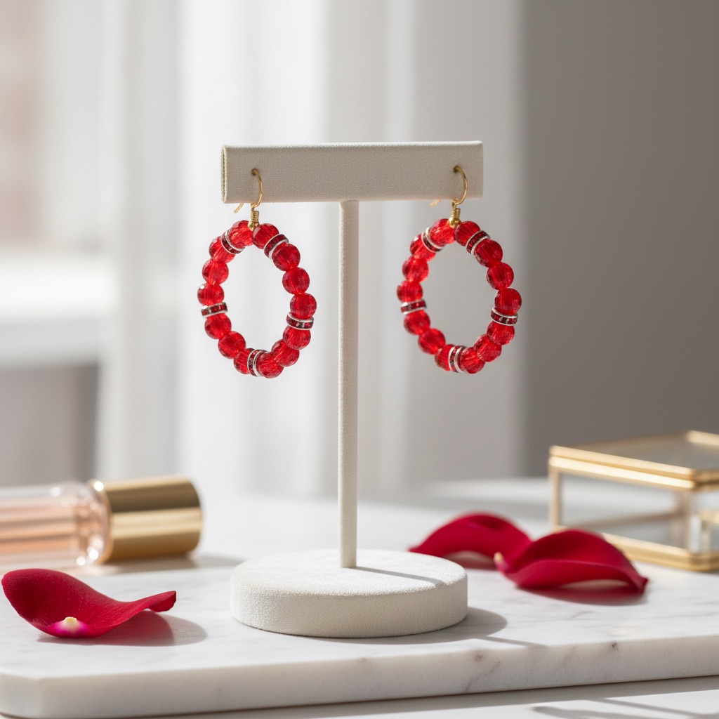 Bold red beaded hoops with sparkling accents that glow with confidence and passion — the perfect statement of strength and style.