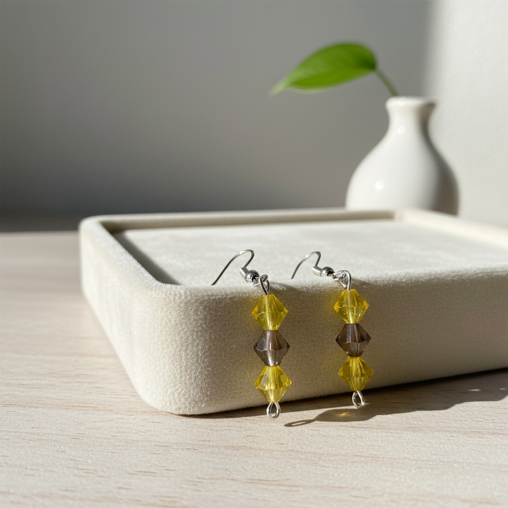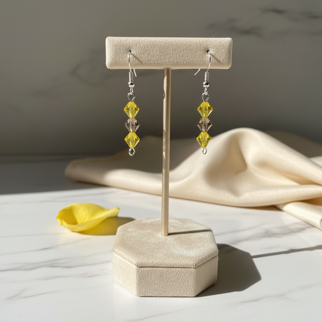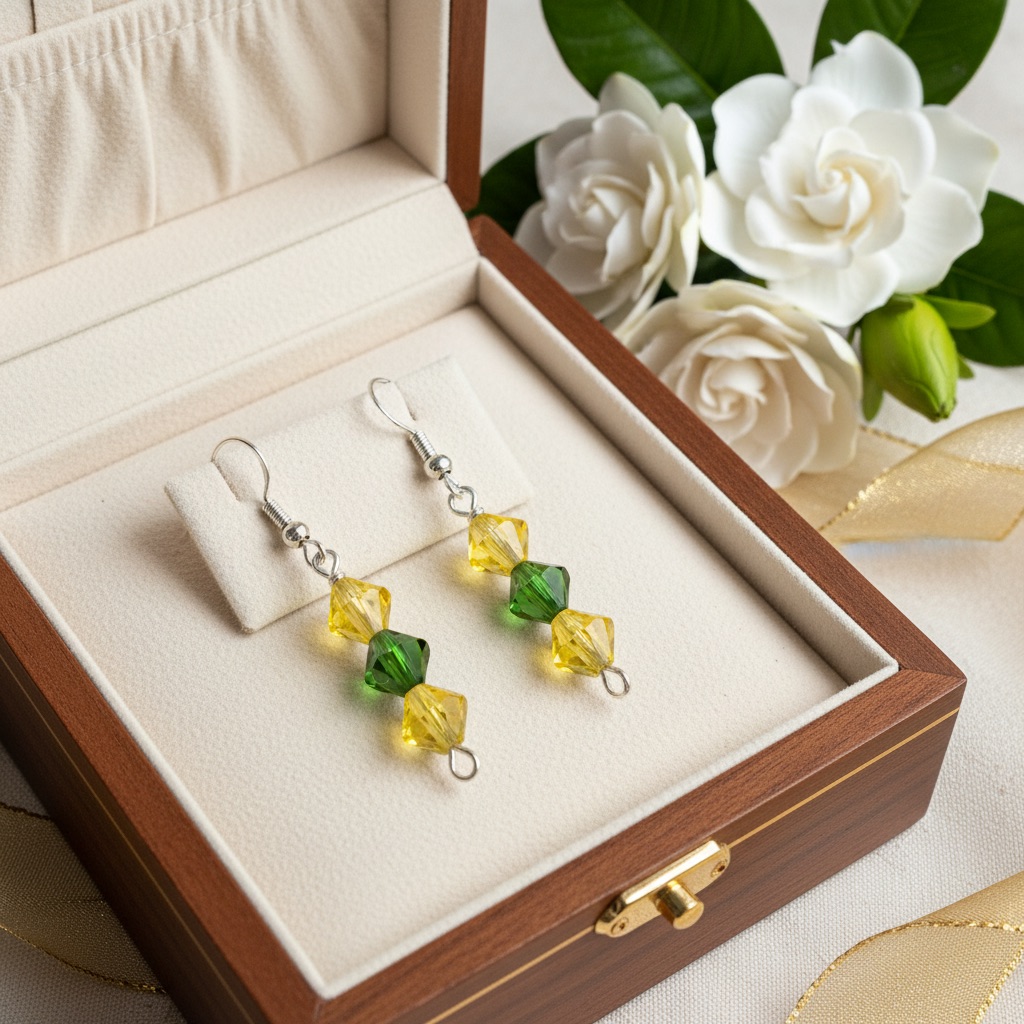 Bright yellow and green crystal beads come together in a simple, elegant drop design inspired by sunlit fields and fresh greenery. These lightweight earrings add a cheerful pop of color and sparkle to any outfit.