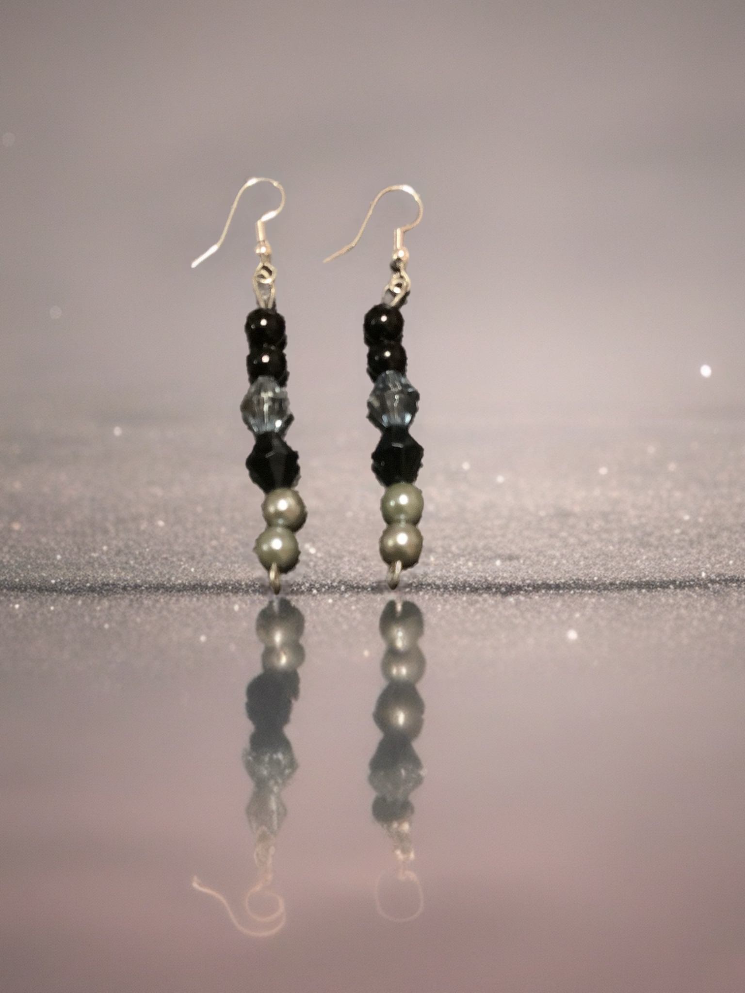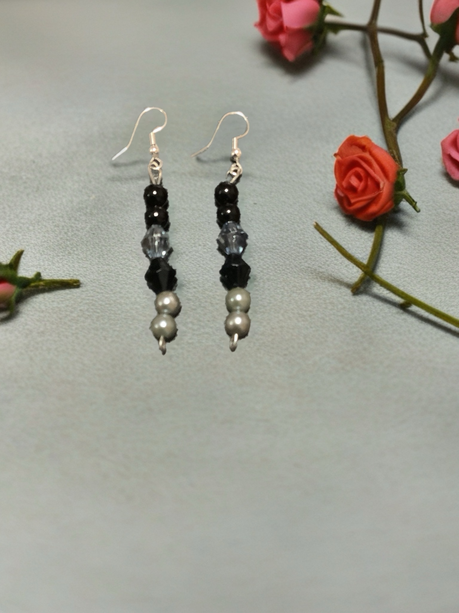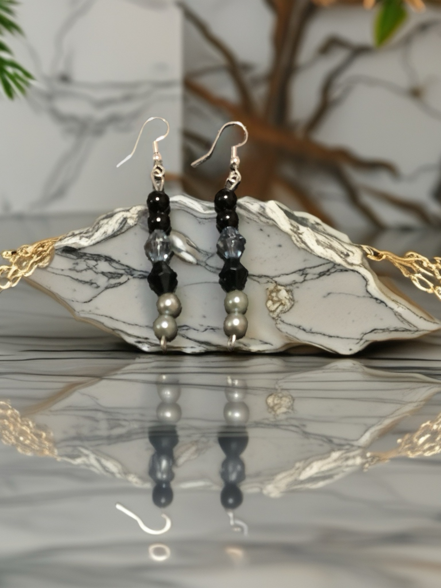 Elegant black and silver beaded drop earrings with crystal accents that add a touch of sophistication and timeless style. Perfect for evening wear or a polished everyday look.
