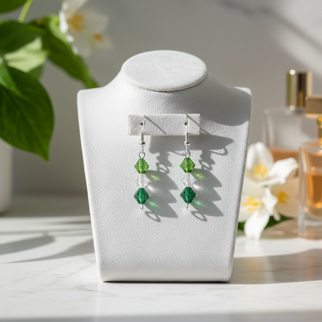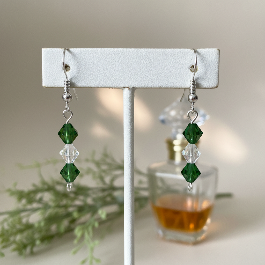 Elegant emerald-green crystal beads paired with silver accents create a delicate drop design full of natural beauty. These lightweight earrings add a subtle sparkle and a touch of fresh sophistication to any look.