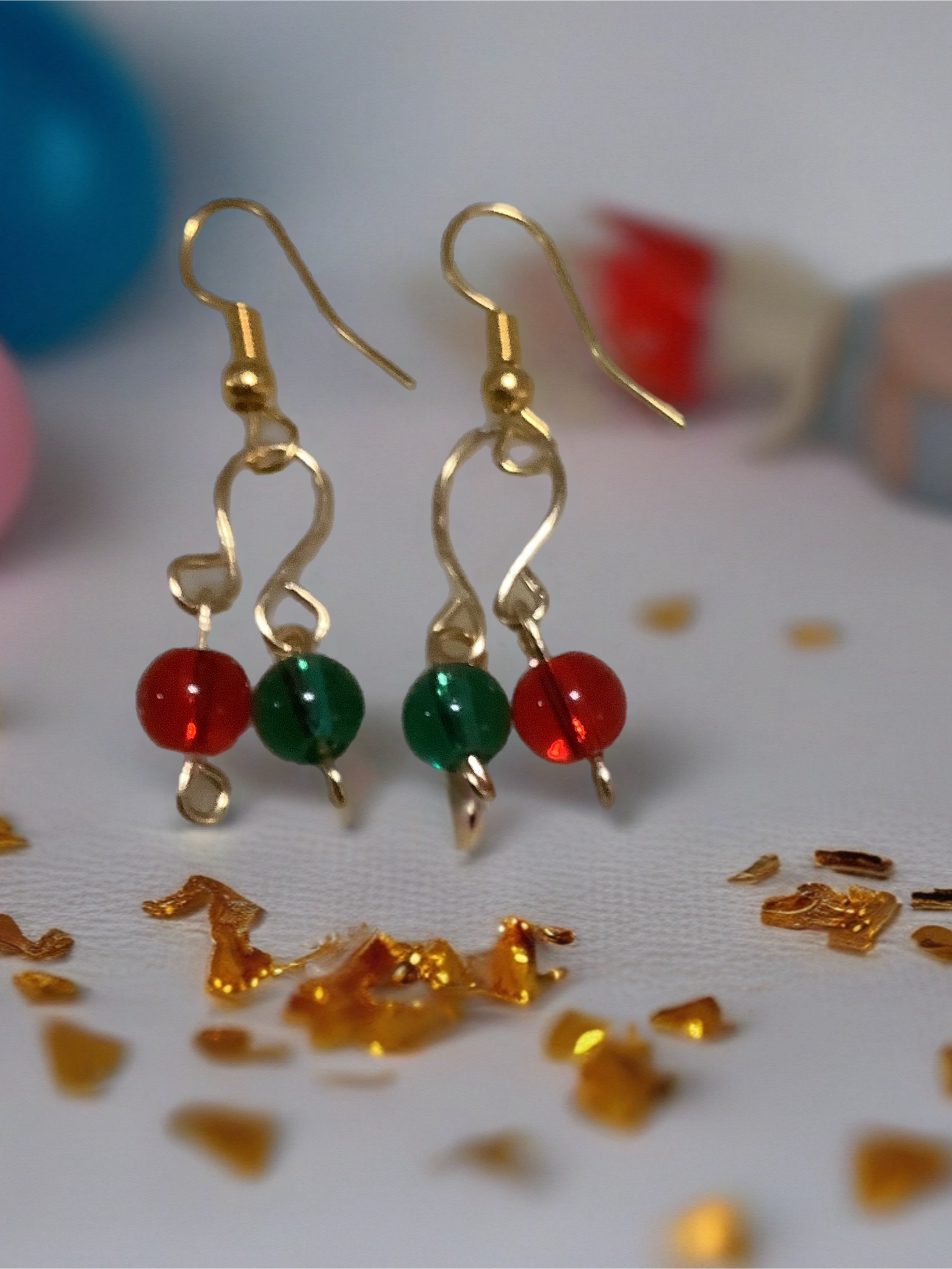 Handmade earrings featuring classic red and green beads with gold accents, creating a cheerful, elegant design perfect for holiday or seasonal wear.
