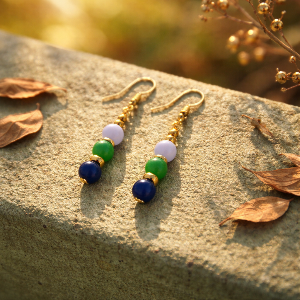 Navy, emerald, and soft lavender beads with gold accents for a bold yet graceful statement. Elegant, colorful, and lightweight.