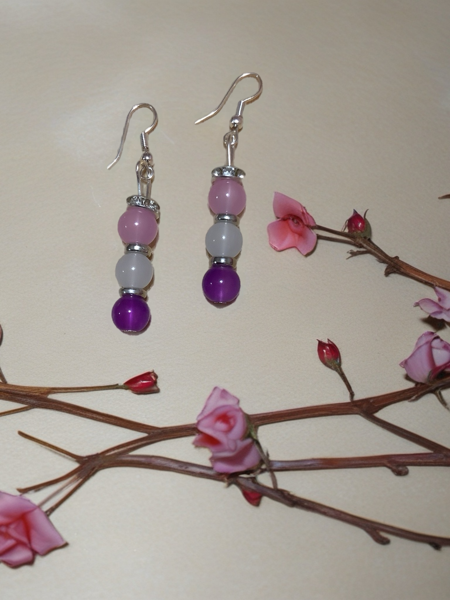 Soft pink, pearl white, and bold violet beads finished with silver sparkle for a feminine, graceful pop. Lightweight and easy to wear.