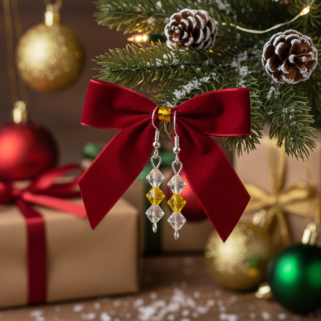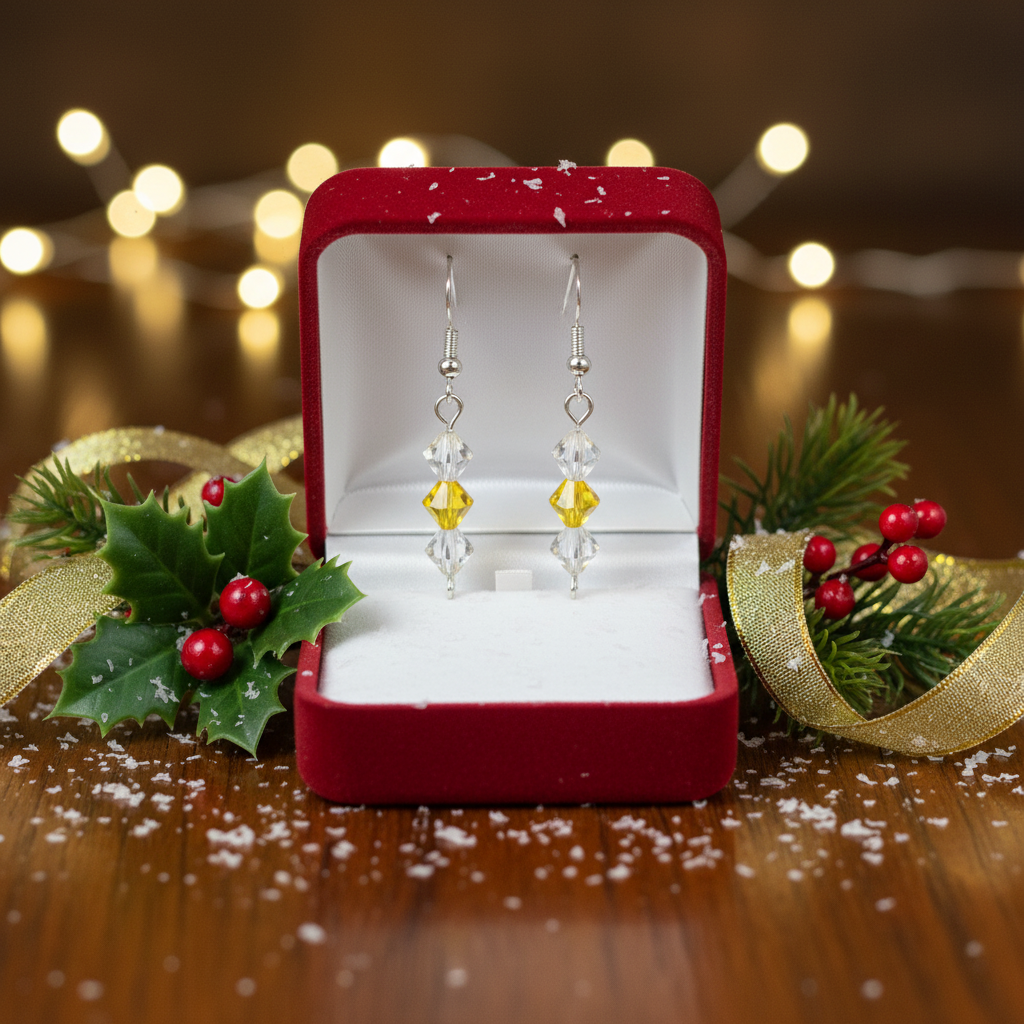 Soft golden-yellow crystals paired with sparkling clear beads create a delicate drop design that shimmers beautifully in the light. These elegant earrings bring a warm, festive glow that’s perfect for both holiday celebrations and everyday sparkle.