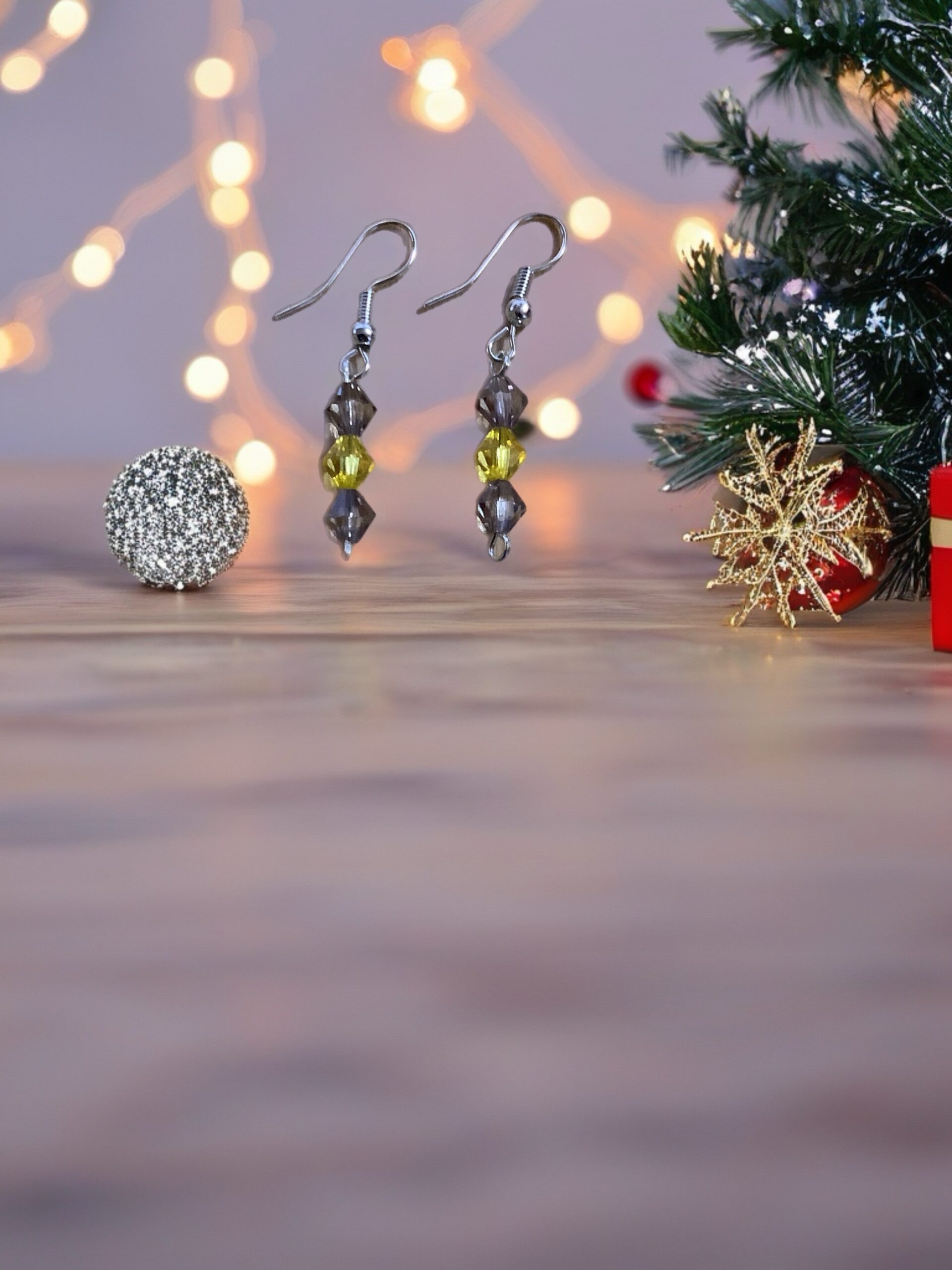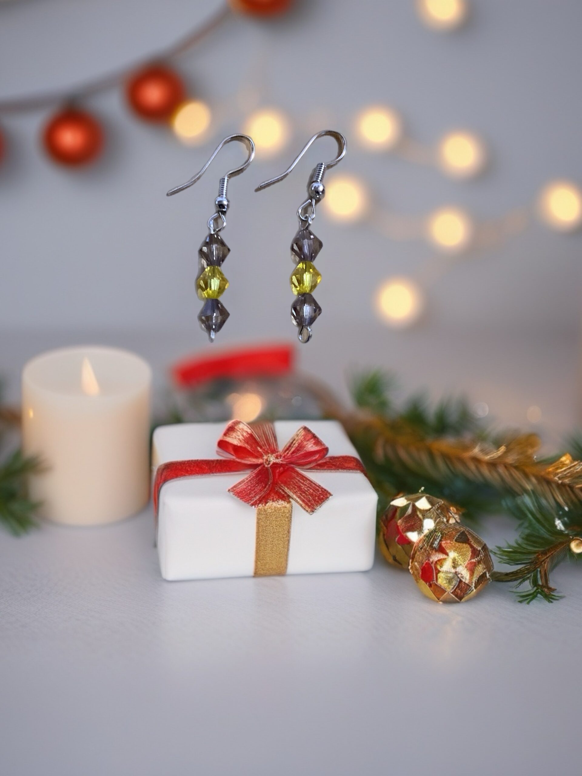 Shimmering golden-yellow crystals paired with smoky gray beads create a graceful drop design with a soft winter sparkle. These earrings bring a refined glow that’s perfect for holiday gatherings or elegant everyday wear.