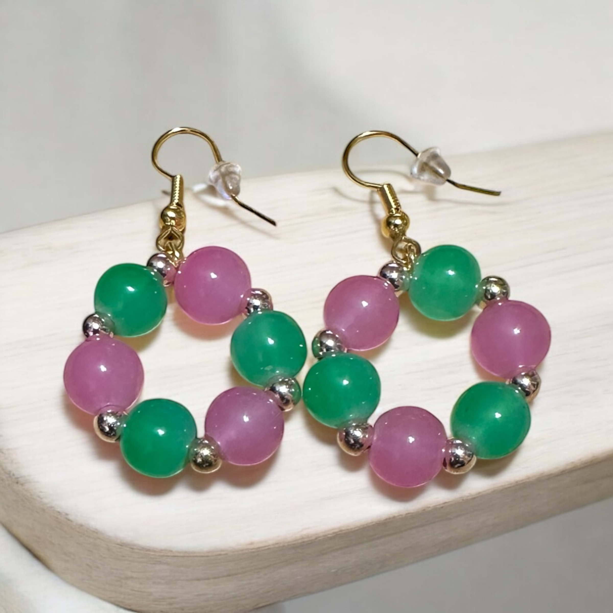 Soft, vibrant, and beautifully balanced — the Blush & Jade Harmony Earrings bring a playful blend of pink and green beads, accented with shimmering silver spacers and gold hooks. These lightweight, charming hoops are perfect for brightening your everyday look or adding a whimsical touch to a special outfit. A must-have for those who love colorful, joyful accessories!